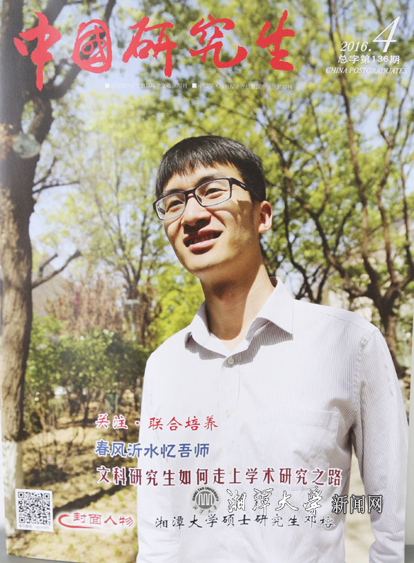 我校歷史系2013級政治學專業碩士研究生鄧榕登上最新一期《中國研究生》雜志(4月刊,總第136期)封面,成為我校學生中該雜志的首位封面人物,也是我省今年首個登上該雜志封面的研究生。同時,該雜志以4000字的篇幅報道了鄧榕的先進事跡,展示了我校研究生勤奮求實、孝老愛親、充滿正能量的精神風貌。
