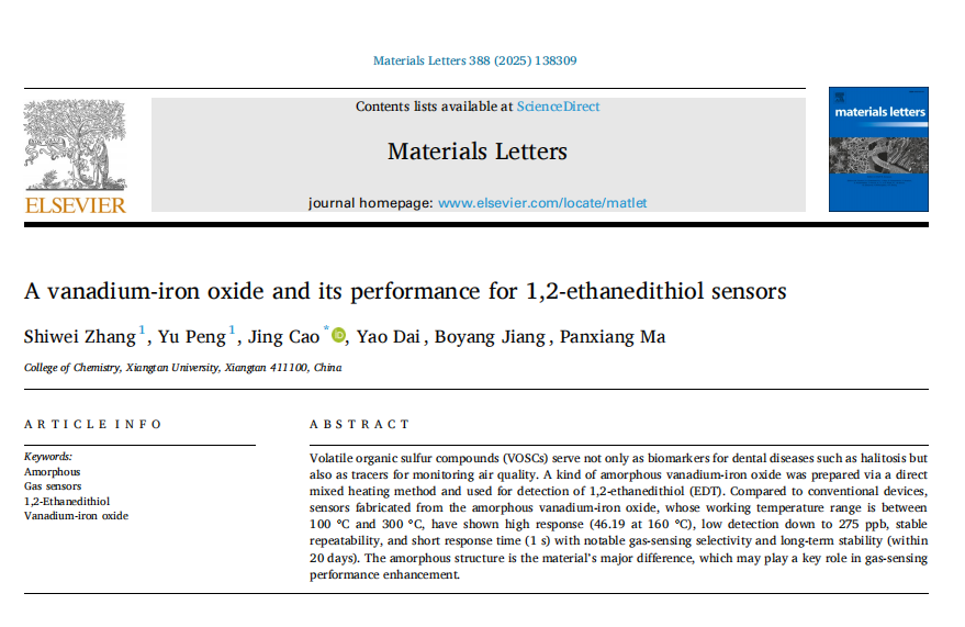 今年2月,曹靖教授課題組本科生、2021級應用化學1班張世煒和彭瑜以共同第一作者身份,在期刊《材料快報》(《Materials Letters》影響因子2.7 JCR 2區論文)發表題為《一種釩鐵氧化物用于1,2 -乙二硫醇氣敏傳感性能》(A vanadium-iron oxide and its performance for 1,2-ethanedithiol sensors)的論文。該論文制備了一種非晶態釩鐵氧化物,并將其應用于1,2 -乙二硫醇(EDT)傳感器。實驗顯示,基于該材料的傳感器在100 - 300℃的工作溫度范圍內,對EDT表現出高響應(160℃時響應值達46.19)、低檢測限(低至275 ppb)、穩定的重復性、短響應時間(1s)以及顯著的氣敏選擇性和長期穩定性。這一成果為揮發性有機硫化合物的檢測提供了新的有效途徑,在環境監測、生物醫學等領域具有重要的應用前景。