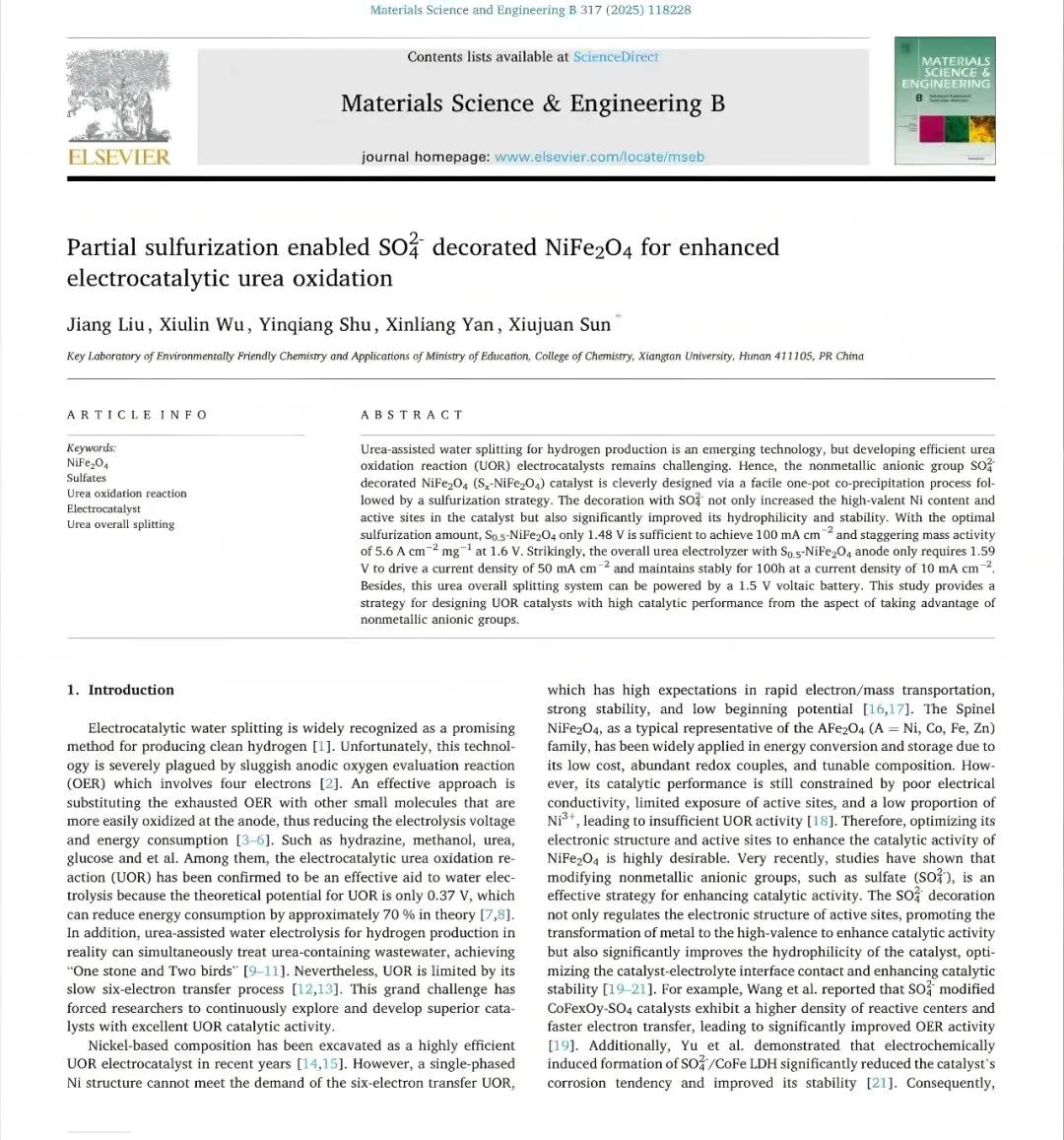 今年3月,孫秀娟副教授課題組本科生、2021級應用化學1班劉江以獨立第一作者身份,在期刊《材料科學與工程B》(《Materials Science and Engineering: B.》JCR二區,影響因子3.9)發表了題為“部分硫化實現SO?2?修飾的NiFe?O?以增強電催化尿素氧化性能”("Partial sulfurization enabled SO?2?decorated NiFe?O?for enhanced electrocatalytic urea oxidation")的SCI學術論文。研究采用簡單的共沉淀法,并結合硫化策略,成功合成了非金屬陰離子SO?2?修飾的NiFe?O?催化劑(S??NiFe?O?)。通過精準調控硫化過程中S源的投放量,實現了催化活性和穩定性的調節。實驗結果表明,SO?2?的引入不僅有效提升了催化劑中高價Ni的含量和活性位點,并且可以顯著增強了催化劑的親水性和穩定性。這一研究成果為基于非金屬陰離子修飾策略設計高性能尿素氧化反應(UOR)電催化劑提供了新的思路,具有良好的應用前景。