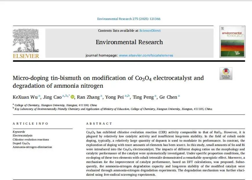 作為獨立第一作者,曹靖教授課題組本科生、2022級應用化學2班吳柯璇已連續發表2篇SCI學術論文。其中,《微量錫-鉍摻雜改性四氧化三鈷電催化劑用于氨氮降解》(Micro-doping tin-bismuth on modification of Co?O?electrocatalyst and degradation of ammonia nitrogen),3月發表于國際著名期刊《環境研究》(《Environmental Research》JCR一區,IF=7.7)。該研究聚焦于Co?O?電催化劑的改性,通過微摻雜錫鉍元素,系統研究了不同摻雜比例對催化劑形貌和催化性能的影響。從實驗結果分析,在特定比例下,錫鉍共摻雜展現出顯著的協同效應,有效提升了催化劑的性能,在氨氮降解實驗中也表現出色。這一成果為開發高效、低成本的電催化劑提供了新的方向,在廢水處理等領域具有潛在的應用價值。