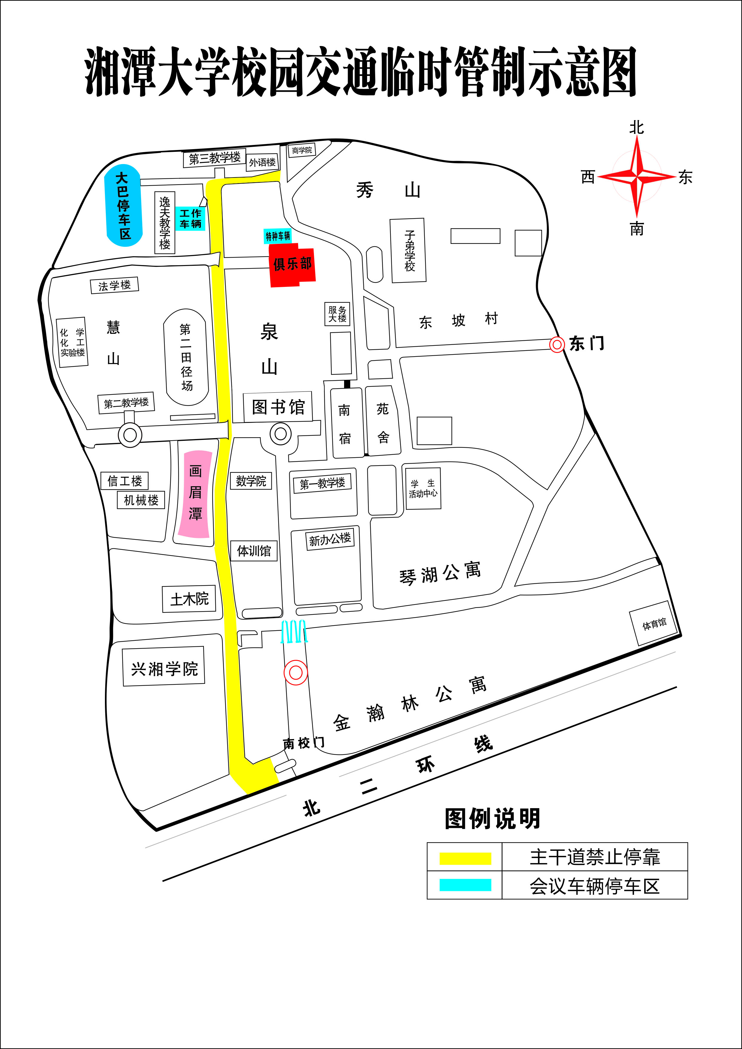 二、交通管制路段:崇文路全線;博學路全線,即:南校門——興湘學院——土木學院——圖書館——俱樂部——商學院前路口。全天禁止停放車輛,管制時間外可以視情通行。