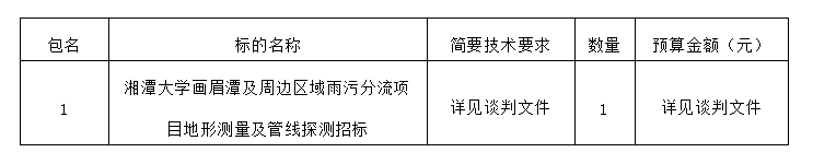 湘潭大學畫眉潭及周邊區域雨污分流項目地形測量及管線探測進行競爭性談判采購,現采用發布公告方式,邀請符合資格條件的供應商提交證明材料參與資格審查,并參與競爭性談判采購活動。
