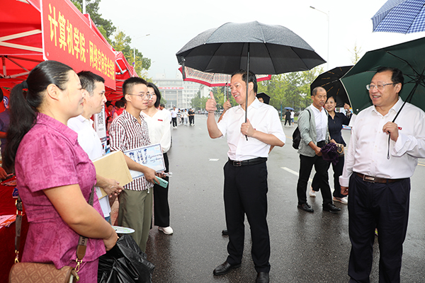 校領導查看迎新工作情況,慰問迎新工作人員,與新生和家長親切交流。