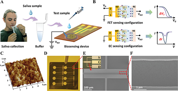 為應對這一挑戰,合作團隊利用延柵型碳納米管場效應晶體管,設計了一種電化學(EC)和場效應晶體管(FET)雙模生物傳感器芯片。該傳感器芯片采用適體探針修飾的延柵(EG)電極,既作為EC傳感的工作電極,又作為FET的敏感電極。基于兩種完全不同的傳感原理,該傳感芯片采用不同的測試結構獨立采集EC和FET兩種信號,從而實現對不同濃度的細胞因子風暴生物標志物的無標記檢測(圖1A)。