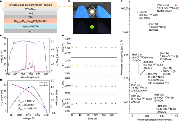 微型核電池是將放射性同位素衰變能轉(zhuǎn)換為電能的裝置。然而,在傳統(tǒng)的微型核電池構(gòu)型中,嚴(yán)重的自吸收效應(yīng)阻礙了錒系α衰變能的轉(zhuǎn)換,使得高效錒系放射性同位素微核電池的開發(fā)極具挑戰(zhàn)(圖1左)。針對(duì)這一難題,團(tuán)隊(duì)提出了一種基于“內(nèi)置能量轉(zhuǎn)換器”的錒系微型核電池架構(gòu),其中錒系核素243Am和發(fā)光鑭系元素Tb3+共組裝成晶態(tài)配位聚合物,實(shí)現(xiàn)了放射性核素與能量轉(zhuǎn)換單元在分子層級(jí)的耦合(圖1右)。243Am衰變產(chǎn)生的α粒子能量極為高效地沉積到周圍的鑭系元素上,產(chǎn)生顯著的輻射發(fā)光現(xiàn)象。在僅使用11μCi放射性核素情況下,內(nèi)置能量轉(zhuǎn)換器中243Am內(nèi)輻照誘導(dǎo)出功率為11.88 nW的自發(fā)光,衰變能到光能的轉(zhuǎn)換效率高達(dá)3.43%。此外,該內(nèi)置能量轉(zhuǎn)換器具有卓越的結(jié)構(gòu)穩(wěn)定性和發(fā)光穩(wěn)定性。據(jù)此,團(tuán)隊(duì)開發(fā)了一種全新的錒系微型光伏核電池,實(shí)現(xiàn)了破紀(jì)錄的0.889%的總能量轉(zhuǎn)換效率和139μW·Ci-1的單位活度功率。該微型核電池在持續(xù)運(yùn)行200小時(shí)內(nèi),性能參數(shù)幾乎沒有衰減(圖2)。該成果為錒系核素在非核燃料循環(huán)領(lǐng)域的資源化利用打開了新的方向。