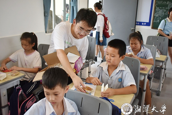 大家還給中學生分發月餅,教他們學習折紙技藝,送上來自湘大馬院的中秋祝福。